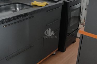 São 2 quartos, sendo 1 suíte. A suíte possui cama de casal e guarda-roupa; o segundo quarto tem guarda-roupa e o terceiro ambiente tem uma bancada, podendo ser usado como escritório. Os banheiros ainda não têm box, mas a proprietária pretende instalar.